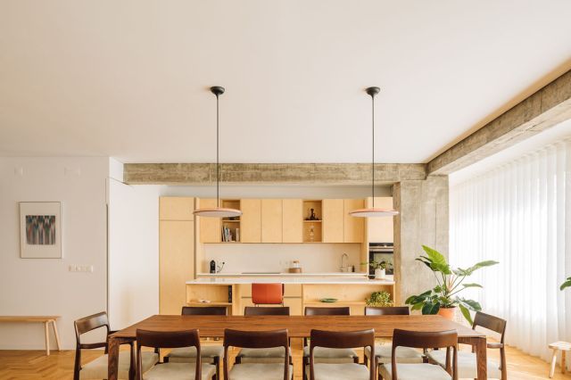 A herringbone timber floor is laid throughout the flat underlining the strategy for a unitary space. It is only interrupted by the terrazzo finish floor of the kitchen and bathroom floor, made from local white marble, limestone. Artificial lighting is designed to complement natural sunlight and to create indirect lighting to the new elements shaded areas and working stands.