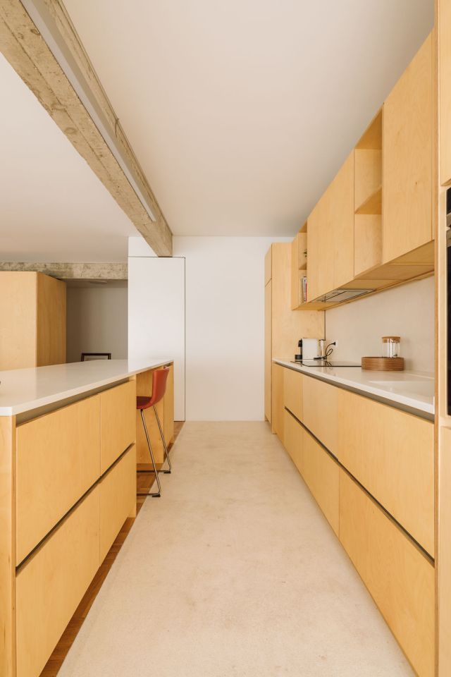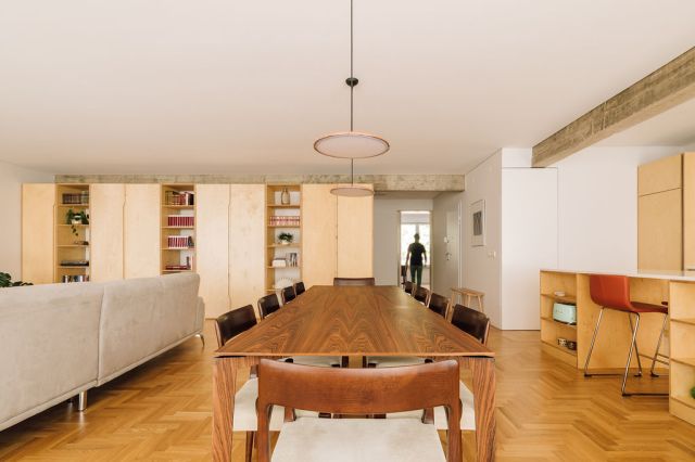 Os novos elementos adaptaram-se à altura constante das vigas de betão armado. Os revestimentos, as portas e os armários da casa são limitados por esta linha marcante do espaço. Um grande armário serve de pano de fundo da sala, resolvendo o lado utilitário de espaço de estante, bar, louceiro, rouparia e bengaleiro. Seguindo a mesma materialidade, os armários da cozinha marcam o outro pano de fundo do espaço de vida social.