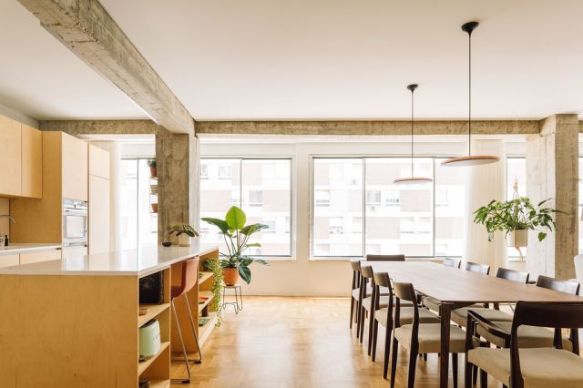 As a start the intervention defines the existing concrete structure as a fundamental and distinctive element, taking the leading role within the new space. The free-plan allowed a clarification of space, by removing existing elements and demolishing obsolete rooms for today’s contemporary life. Social and services were combined into one large space, becoming the house social node and taking advantage of the sunlight of the fenêtre-en-longueur.